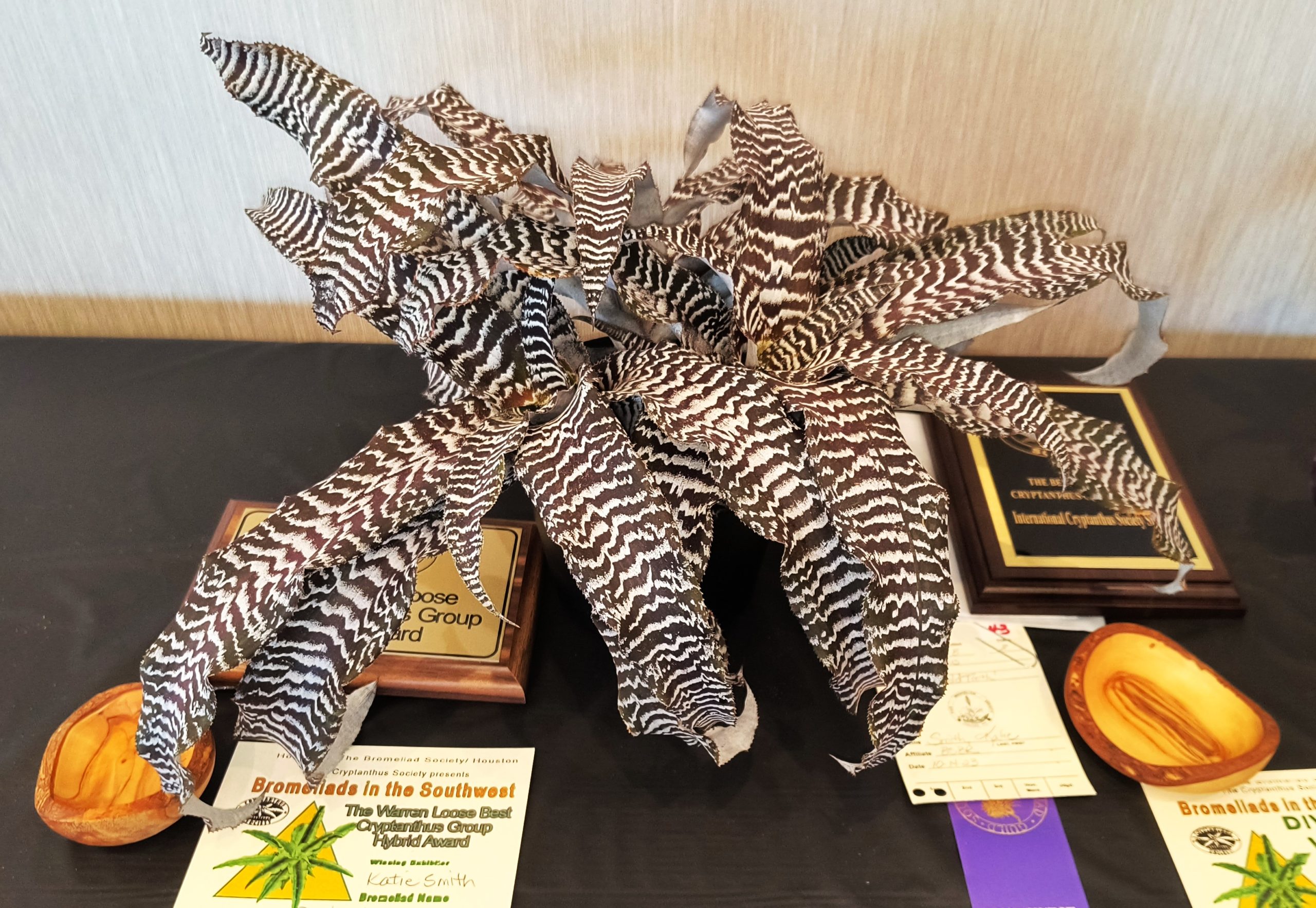 THE BOB WHITMAN BEST CRYPTANTHUS SPECIES Cryptanthus fosterianus ‘Lisa Vinzant’ – Katie SmithBEST DECORATIVE CONTAINER – DIV V Cryptanthus marginatus – Ruby AdamsBEST INDIVIDUAL CRYPTANTHUS DIVISION I Cryptanthus ‘Beav’ – Ed EdmistonGRACE GOODE SILVER INGOT BEST CRYTANTHUS HORTICULTURE Rokautskyia microglazioui – Ed EdmistonMORRIS HENRY HOBBS BEST OF SHOW ARTISTIC _ MICHAEL YOUNG BEST OF SHOW ARTISTIC – Cryptanthus – Dr. Larry GirouxTHE WARREN LOOSE BEST CRYPTANTHUS HYBRID _ BEST CRYPTANTHUS MULTIPLE – DIV II Cryptanthus ‘Very Cold Tooth’- Katie Smith